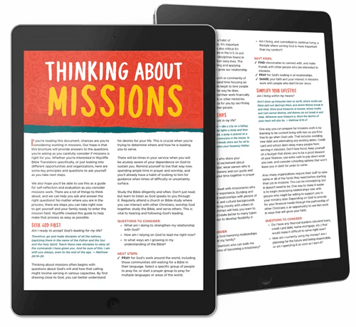 Wondering if missions is for you? Get our free PDF called “Thinking About Missions” when you sign up for our e-newsletter. You'll also receive monthly Bible translation updates called "God Sightings" plus stories to help you consider serving, job alerts and invitations to special events.